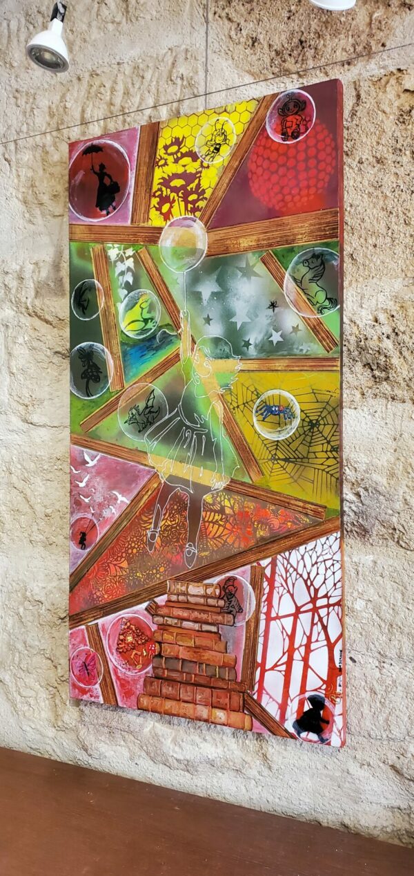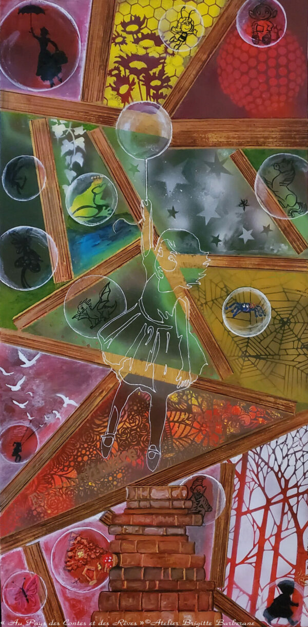 Une petite fille en filigrane, perchée sur une pile de livres 📚, s’élève vers ses rêves portés par une bulle…